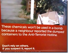 On the subject of signs, these anti-terrorism posters have shown up in the local Park ‘n Ride. I have mixed feelings about them: where the treat is real, I suppose that they could save lives. At the same time, they seem calculated to promote surveillance and suspicion and undermine community trust and tolerance.