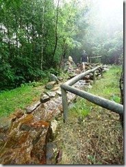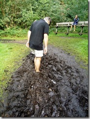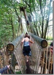 It’s an interesting experience, the path changes texture all along the way. The grass was soft and cool, infinitely pleasing; stones were sharp and miserable. There was knee-deep water and shin-deep mud, squishing between my toes and warmly caking my ankles. Startled toads emerged from the soup as we squished through, hopping off into the woods. The hills were a little challenging to climb, even with log steps to balance on; the tower even moreso