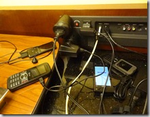 This rat’s nest of wires and gadgets is my on-road kit, recharging: Three phones, a computer, a camera, an mp3 player, a clock/alarm, sometimes a TomTom or voice recorder, all with universal adapters. They nestle into a shoulder bag, which also has my diary, my expense book, my notes-book, a Dutch dictionary, Dutch workbook, magazines, a book or two, hair brush and reading glasses.