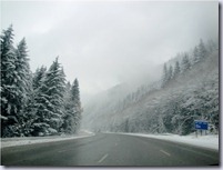I tossed the snow tires and chains into the van and headed to the garage to get the wheels swapped. On the road, finally, at 9, there was ominous cloud to the east and the signage wasn’t encouraging.